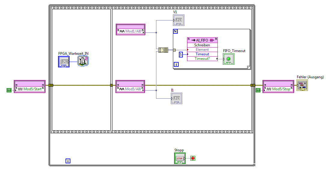 Nun plage ich mich mit dem FIFO in LabVIEW herum. Ich schreibe Werte von zwei AI-Modulen (NI 9223 & NI 9227) in ein FIFO. Die Wartezeit in dem FPGA Programm lässt sich einstellen (siehe Screenshot).