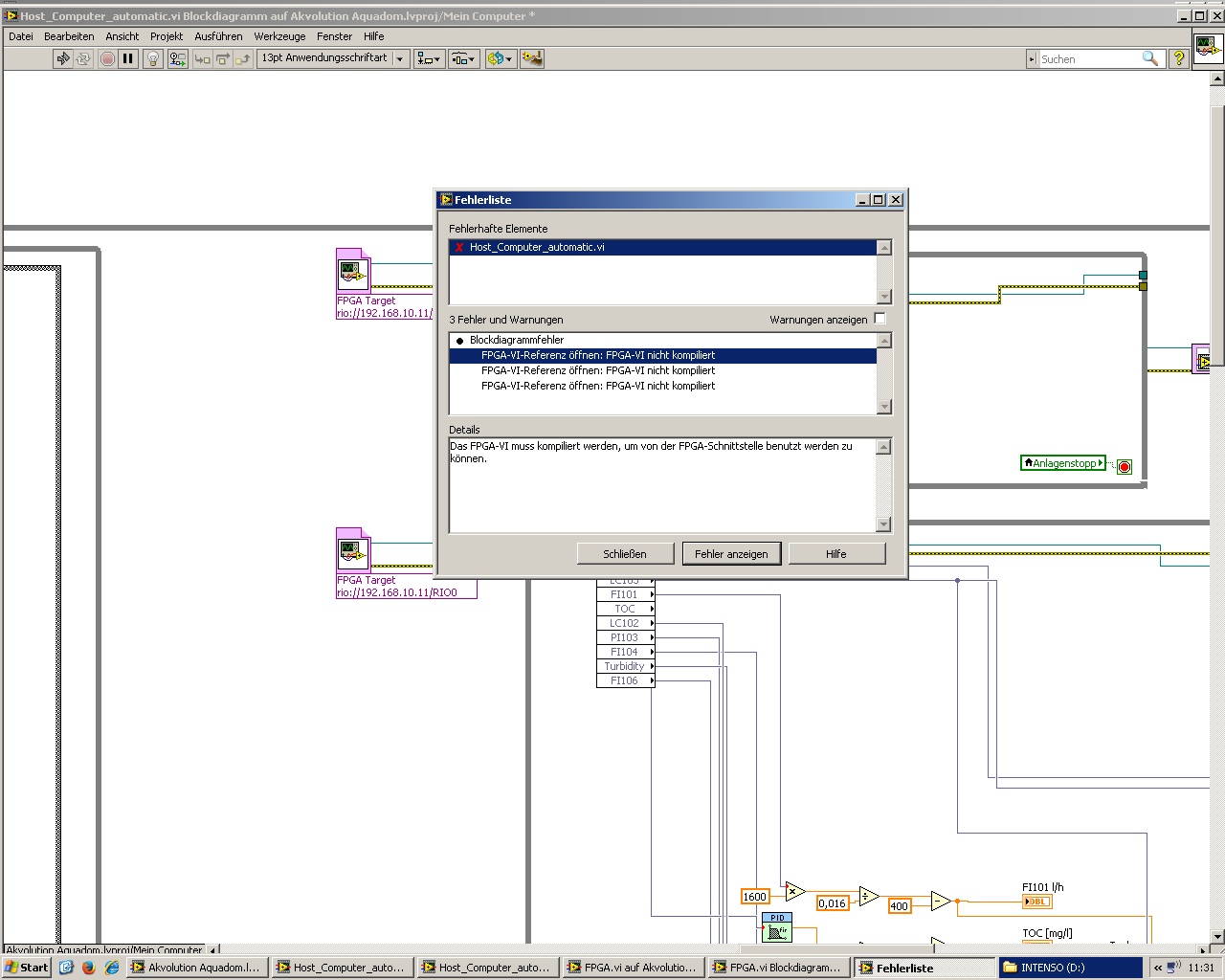 Nachdem ich das von mir bearbeitete VI ausprobiert hatte funktioniert es nicht mehr. Fehlermeldung beim Ausführen des Host-VIs: FPGA-Referenz öffnen: FPGA-VI nicht kompiliert