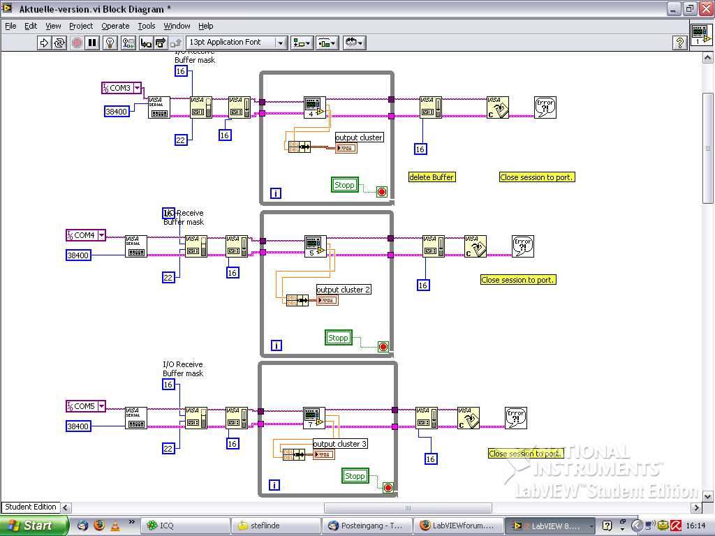 Du könntest folgendes probieren: Mach aus der Schleife, die die VISA's ausliest (das ist also die obere), alles raus, was auf das Frontpanel zugreift. Das ist der Cluster, der die Daten anzeigt, und die Variable des Stopp-Buttons. Ersetze die Stopp-Variable durch einen Melder und den Cluster durch eine Queue. In der Hauptschleife setzt du den Melder zum Stoppen und ließt die Queue aus.