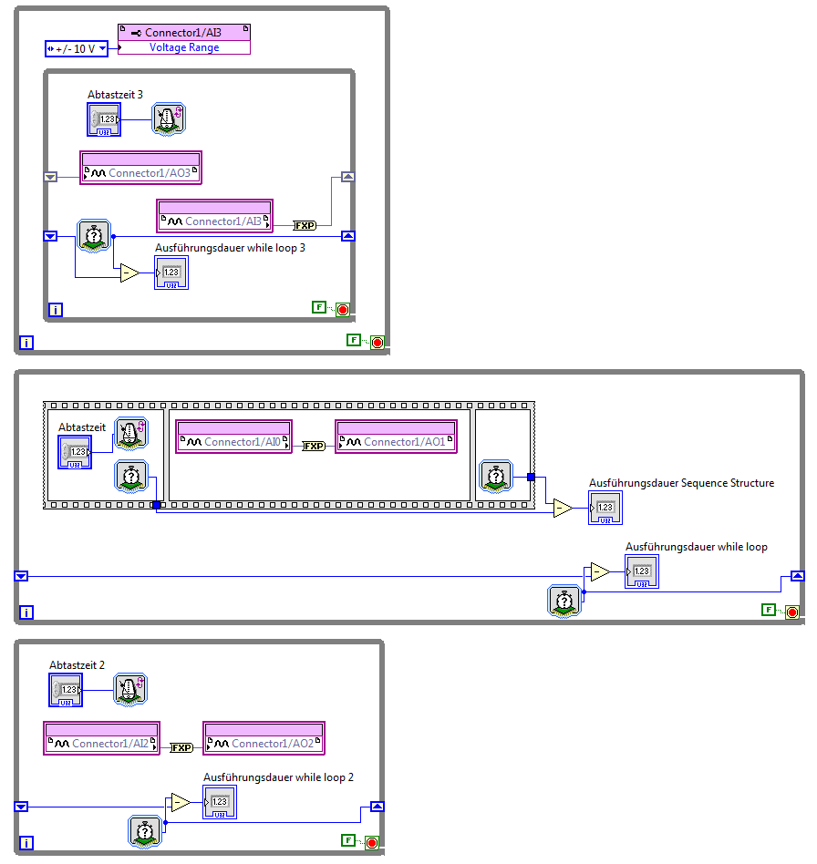 Ich habe drei verschiedene Schleifen, die im Anhang "Zeitverzögerung Datenerfassung_Datenausgabe_Blockschaltbilder2" abgebildet sind.
