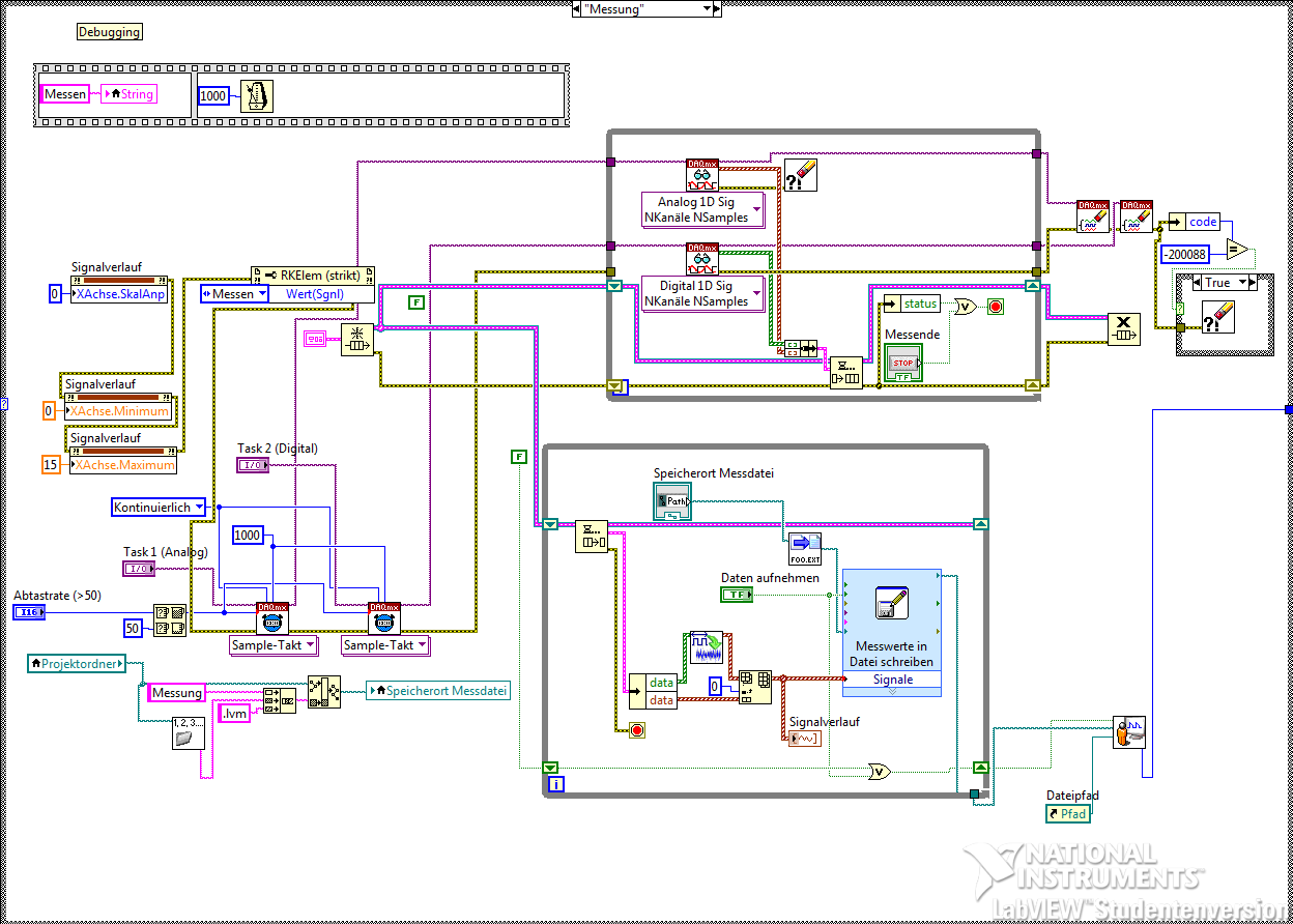 So, nachdem ich hier schon einiges an netter Hilfe bekommen habe - nochmasl vielen Dank dafür! - wende ich mich wieder einmal an euch. Und zwar geht es immer noch um das selbe Tool wie letztes Mal, das zur universellen Messung von Analog- und Digitaleingängen mit dem USB-6009 dienen soll. Mein aktuelles Problem ist: Trotz Producer-Consumer-Schema "laggt" das Tool ab und zu bei der Anzeige, und noch viel eher wenn ich die Daten in eine Datei speichere (ich kann zwar gut damit leben, aber vielleicht liegt das ja mal wieder an einem groben Schnitzer meinerseits).