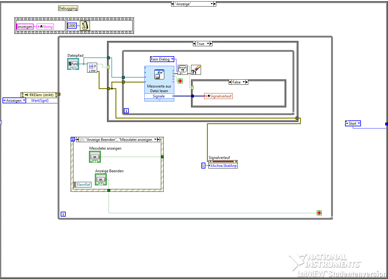 PS: anzeige.png ist der Teil des Tools, der alles anzeigt, messung.png zum Messen (wie die Namen auch erklären); tool.png ist ein Screenshot von der Anzeige, in der Lücken beim analogen Verlauf klaffen und die digitalen Werte ganz fehlen, und das SubVi ist zuständig für die Umwandlung des digitalen Signalverlaufs in analoge Werte, damit beides in einem Diagramm angezeigt werden kann.