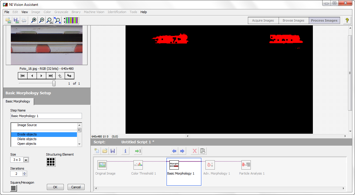 Damit hast du dann dein Schwarz-Weiß Bild. Leider hat es vielen anderen Unsinn, außer deine großen Blobs, die kriegst du gut mit Morphologie weg. Und dann noch schnell mit "Particle Analysis" zählen lassen, und damit ist dein Programm eigetnlich schon fertig. Was du jetzt noch machen musst, ist ein LabVIEW Programm daraus.