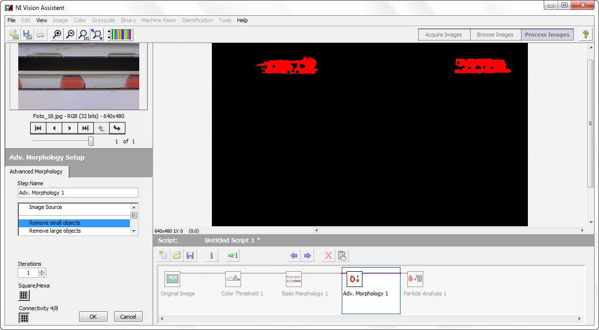 Damit hast du dann dein Schwarz-Weiß Bild. Leider hat es vielen anderen Unsinn, außer deine großen Blobs, die kriegst du gut mit Morphologie weg. Und dann noch schnell mit "Particle Analysis" zählen lassen, und damit ist dein Programm eigetnlich schon fertig. Was du jetzt noch machen musst, ist ein LabVIEW Programm daraus.