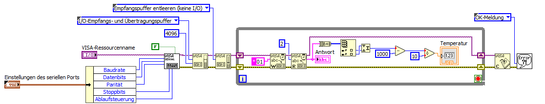 Ich habe inzwischen eine Version geschrieben, die den Fehler auffängt und ignoriert. Funktioniert gut. Nur einen Wert auslesen will ich, weil das ganze zeitlich abgestimmt mit anderen Messgeräten laufen muss. Die Initialisierung und das Schließen des Ports habe ich dafür in eigene VIs gepackt und die werden nur einmal benutzt, keine Sorge. Im richtigen Moment frage ich eben nach einem Wert, aber das passiert öfters, da hast du schon recht. Wie gesagt, ich wollte ja nur erst eine kompakte Version schreiben, um das Thermometer zu verstehen. Dieses Phänomen mit der while-Schleife verstehe ich allerdings immer noch nicht.