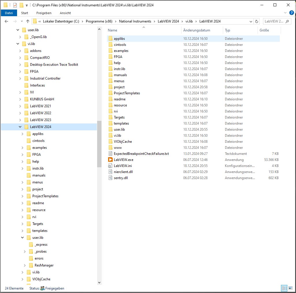 Die ausführbare Datei "LabVIEW.EXE", also die IDE selbst, gehört doch wohl in den Ordner "National Instruments/LabVIEW 2024". Sie liegt aber im Ordner "National Instruments/LabVIEW 2024/vi.lib/LabVIEW 2024" (Bild3). Wie kommt denn die dort hin?