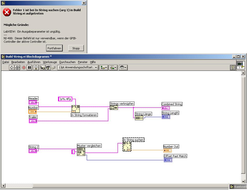 (2) Englische Version: Das beigefügte VI funktioniert nur wenn mindestens zwei Strings eingegeben werden. Bei Eingabe von nur einem String wird der Fehler 85 (Falsches Eingabeformat) ausgegeben.