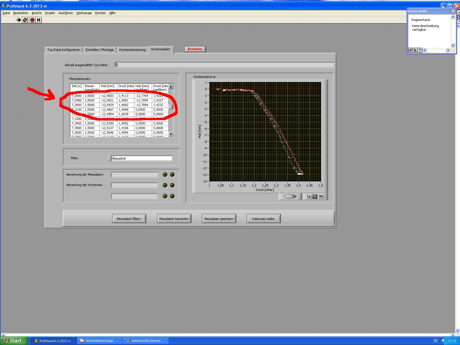 Ich zeichne über den Hub- und den Druckverlauf eine Hysterese von Über- bzw Unterdruckdosen in einem Graphen auf.
