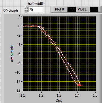 Diese Messwerte möchte ich mit einem biquadtarischen Mittelwert "filtern" und mit einer roten Linie in den Graphen einfügen.