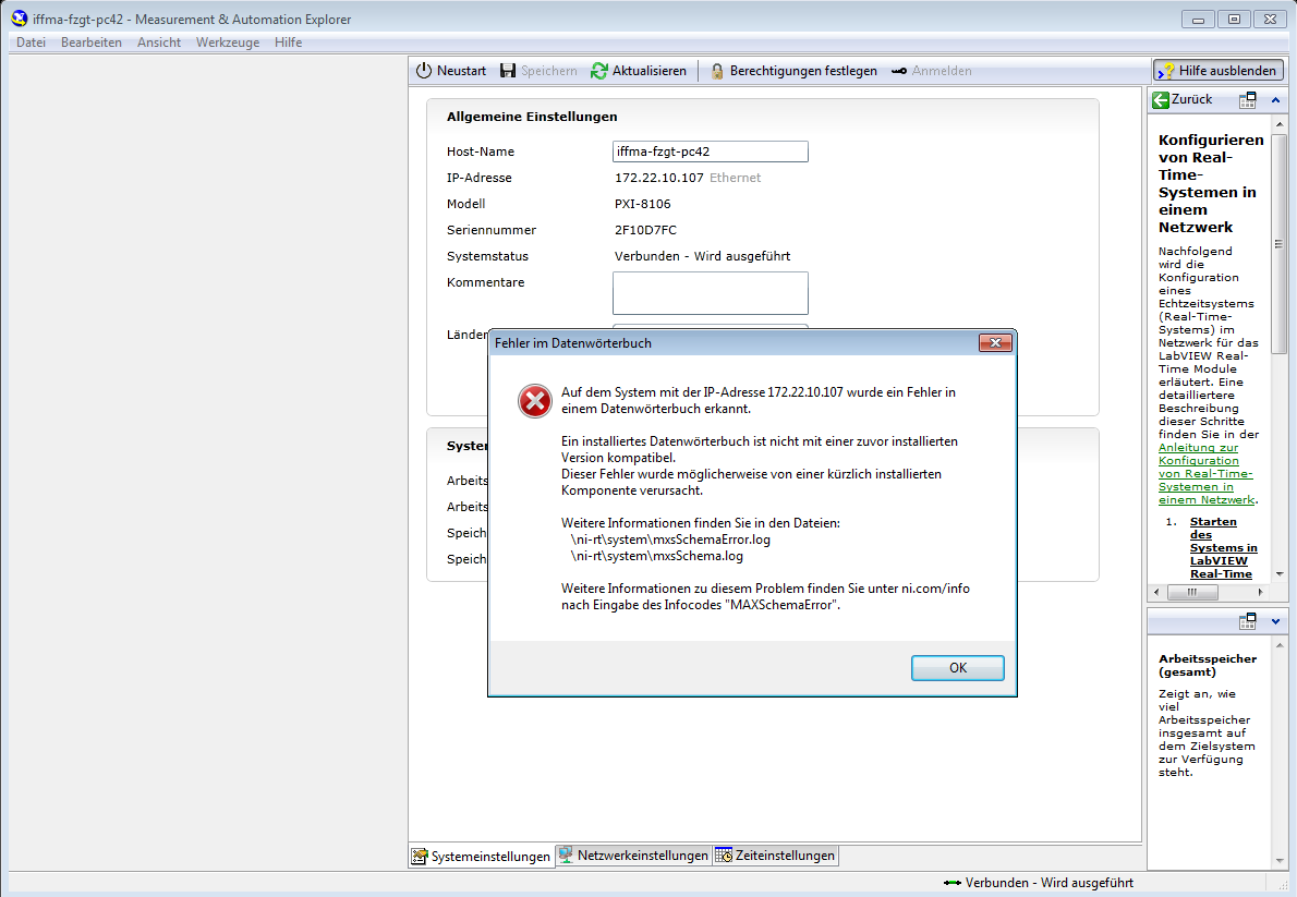 seit 4 Tagen habe ich ein Problem mit meinem Real-Time System PXI-1042 bzw. dem Controller PXI-8106, auf welche ich im Netzwerk zugreife.