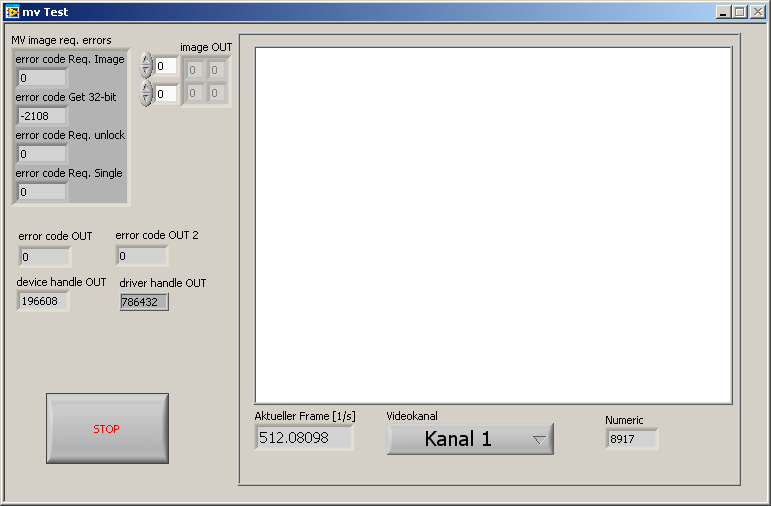 Ich habe hier einen vom Kunden beigestellten Framegrabber "mvTitan" von MatrixVision + Treiber (div. dll's) + Kamera . Wenn ich diesen in der LV-Entwicklungsumgebung auslese, funktioniert alles bestens (Bild da, Framerate ok, alle Handles da, keine Fehlermeldung), wie folgender Screenshot zeigt:
