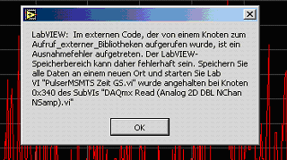 Mach' mal nach Deinem "DAQmx Read" ein "Clear Task" (Stichwort: Speicherdeallokierung). Sonst läuft Dir unter Umständen der Speicher voll.