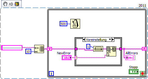 Die Initialisierung des Arrays mit "--------" und der Startwert für "ErrorCounter" sind außerhalb des VIs und findet bei Programmstart statt.