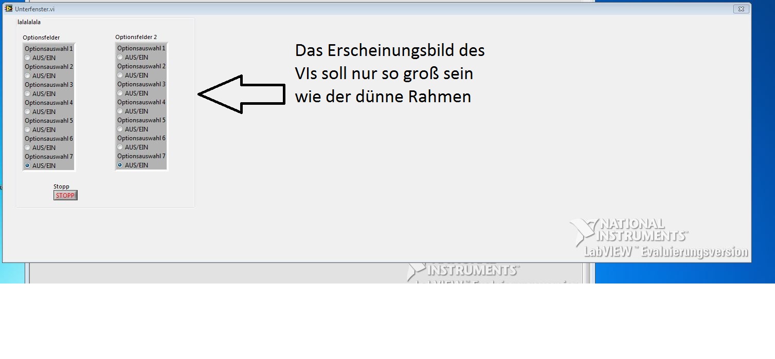 Das Frontpanel ist immer genauso groß wie im "Bearbeitungsmodus". Das ist unpraktisch. Ich habe um die drei Buttons einen Rahmen gezogen, die Rahmengröße wurde angezeigt und ich habe bei den VI-Eigenschaften unter Fenstergröße die Rahmengröße angegeben.