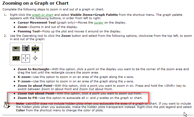 LabVIEW arbeitet also ganz normal, das von dir ausgewählte Tool aus der Graph-Palette führt einmalig ein Autozoom der x- und der y-Achse durch. Dieses Knopf gibt es auch einzeln für die Achsen in der Skalen-Palette.