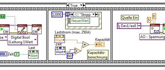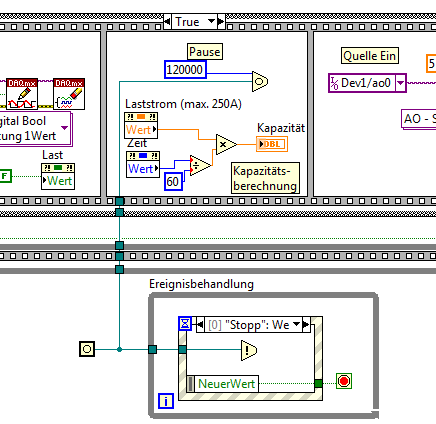 An der Stelle wo die Ereignissstruktur eingefügt wurde, benötige ich keinen Stopp. Ich würde einen Stopp für das gesamte Programm benötigen, egal an welcher Stelle es momentan ist. Das ist mein Problem. Und die .txt-Datei wird auch nicht komplett ausgefüllt. Bei dieser wird nur der Entladevorgang aufgezeichnet der im Rahmen 3 in der While-Schleife festgehalten ist. Aber der Ladevorgang auch in Rahme 2 aber in der flachen Sequenz wird nicht mit aufgezeichnet. Das ist auch noch so ein Problem was ich habe. Aber hauptsächlich das Stopp-Problem.
