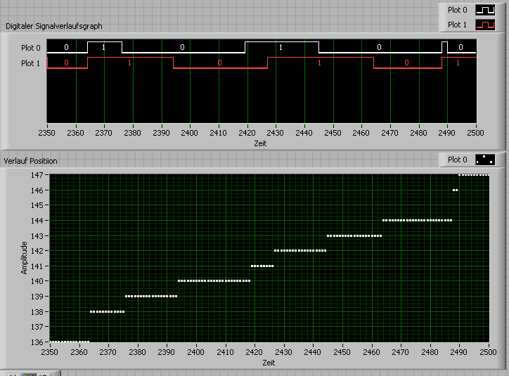 Les ich das ganze aber in LabVIEW ein - ihr habt ja die Fehlerhaften Eingabedaten (fehlerhafte Zustandswechsel) ja gesehn - hab ich plötzlich keine gleichmäßigen Rechteckssignale mehr!
