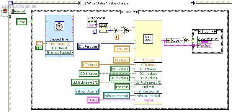 [*]2 normale While-Schleifen, welche lediglich mehrere Events abfangen. In der 2. Schleife (nennen wir sie event-loop) wird ua. auch das "Write status"-Value-Changed-Event abgefangen (Screenshot 3) und ein Sub-VI aufgerufen, welches wiederum die aktuellen Werte in die Protokoll-Datei schreibt<>
