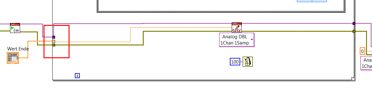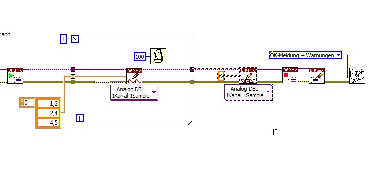 Der Fehler ist, dass Du die LV-Beispiele DAQmx/Ausgabe nicht angeschaut hast. Ausgabe funktioniert so: Erst mit DAQmxWrite Daten bereitstellen, dann starten. Nicht umgekehrt.