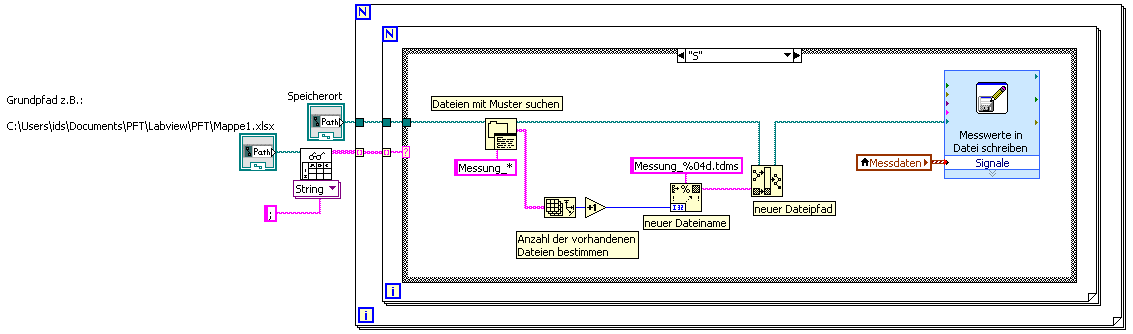 Ich programmiere gerade einen automatischen Ablauf für einen Versuchsstand. Dabei sollen 10 Durchläufe zum Warmfahren gemacht werden und dann zum Beispiel die nächsten 3 Versuche gemessen und gespeichert werden. Den Ablauf steuere ich über eine CSV-Datei und das klappt auch alles wunderbar. Mein Problem liegt an der Speicherung. Ich möchte gerne, dass die Messwerte in einer Datei gespeichert werden, die einen vorgefertigten Namen und Pfad haben. Es soll nun lediglich fortlaufend nummeriert werden, d.h. ich gebe in meiner CSV den Befehl den Speicher-Case durchzufüühren und die Datei soll Messung 1 heißen. In der nächsten Zeile das gleiche, nur die Datei soll Messung 2 heißen usw...Der Benutzer soll davon am besten nichts mitbekommen. Wenn dies gelungen ist, soll in einem weiteren Case, in dem die Auswertung stattfindet, nacheinander die Dateien aufgerufen und bearbeitet werden.