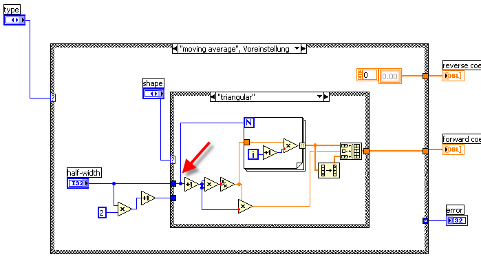 Achtung: Dreieckgewichtung Filterkoeffizienten.vi enthält einen jahrelangen Fehler. Der Anschluß N der Forschleife ist falsch angeschlossen. Der Pfeil zeigt es richtig. Das VI änderen und abspeichern.