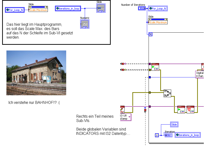 EDIT: OK, es geht nicht. Ich habe 2 globale Variablen erstellt, eine für das N meiner Forschleife und eines für mein i der Forschleife. Diese mit "READ" im Haupt-VI eingefügt passiert leider Nüsse. Weder aktualisiert sich der Balken noch werden die Iterationen wiedergegeben. Es rennt gleich wie vorher... -.-