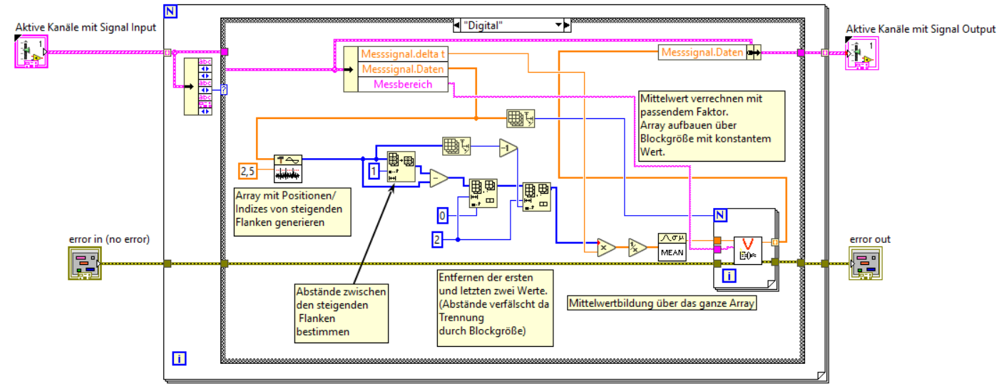 Um euch abzuholen erzähle ich erstmal etwas über die allgemeine Aufgabestellung: Ich programmiere ein neues Messprogramm für einen Prüfstand, welches mehrere digital und analog Signale visualisieren, umwandeln und abspeichern soll. Die verwendete Hardware ist nicht von NI sondern von einer kleinen Hardware-Schmiede names Geitmann und arbeitet mit einer dll. Passende Treiber dazu gab es vom Hersteller. Das Messprogramm ist als state machine verwirklicht. Da gibt es bestimmt bessere Wege. Soweit funktioniert es aber schon. Grob .