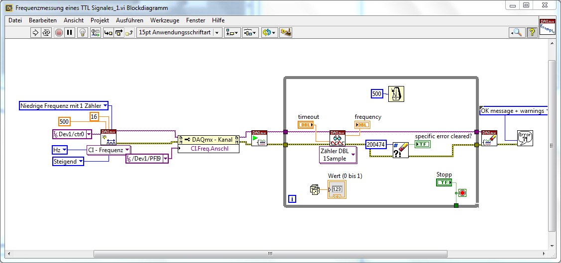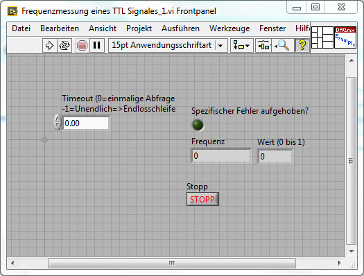 Den Timeout habe ich meiner Meinung nach so stehen, dass das "DAQ max-Lesen" nur einmal versucht die Frequenz zu lesen. Damit möchte ich Verhindern, dass meine dann paralell laufenden Messungen auf den Timeout warten müssen.