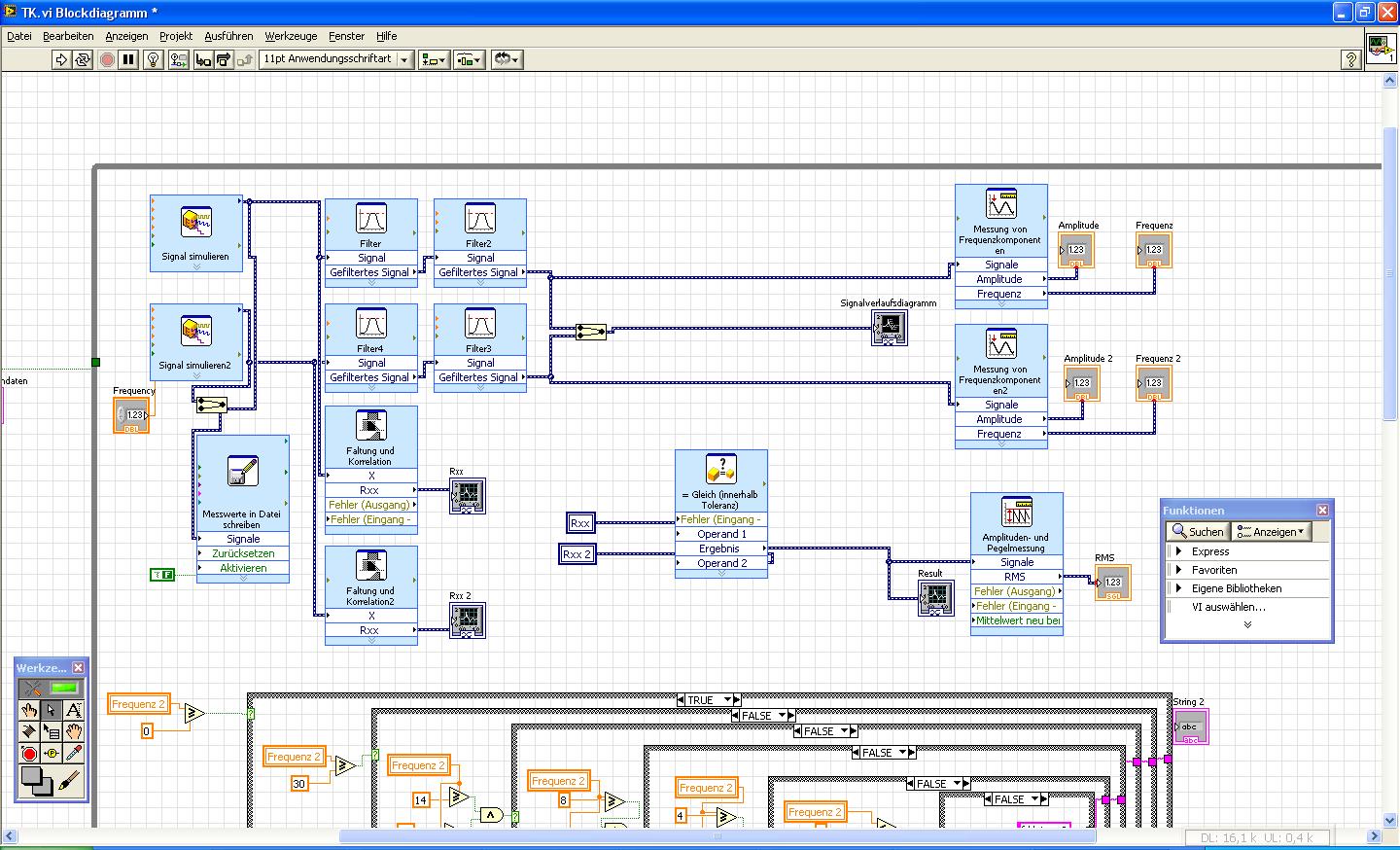 Das es auch die "normalen" Sachen in der Funktionspalette gibt, ist mir schon bewusst;)Denke mal, dass viele die Express-VIs benützten, weil es schnell und einfach den Zweck erfüllt :lol:Das ist ja auch das gute an LabVIEW, dass User die möglichkeit haben ohne großes Know How etwas Programmieren können dank Express-VIs, die dazu noch sehr benützer freundlich sind und einfach zu bedienen. Nen beispiel: die Korrelation habe ich auch als "normales" VI gefunden, doch wenn ich mir die Anschlüsse so anschaue, dann habe ich manchmal kein Plan wie ich das verbinden soll Rolleyes