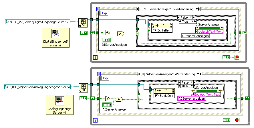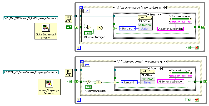 Sobald ich eine EXE erstelle funktioniert das Ein- und Ausblenden nur noch bei dem unteren Programm (AnalogEingaengeServer.vi). Bei dem oberen Programm tut sich nichts.