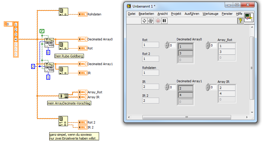 Zitat:Decimate Array liefert keine Werte. Index Array liefert die Werte nur(!) an rot. Abwechseln tun diese nur beim Continuous Decimate...