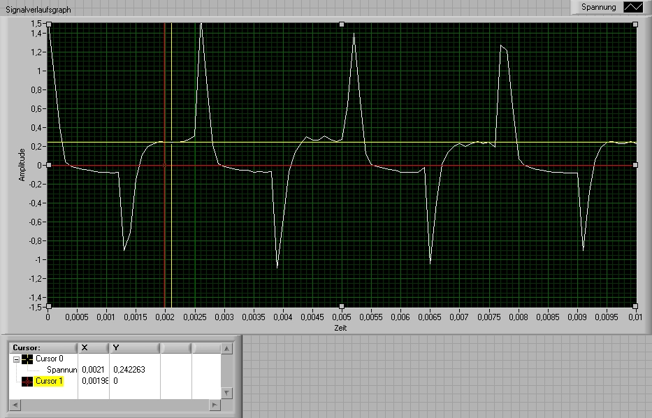 Ich habe hier einen Drehratensensor, der eine Gleichspannung ausgeben soll, die ich mit einem Multimeter auch mit realistischen Werten lesen kann. Wenn ich allerdings mit dem NI-6008 messe, dann erhalte ich eine Kurve wie im Anhang dargestellt. Hier scheint es nun so zu sein, dass der Teil der Kurve, der jeweils vor der (positiven wie negativen) Spitze kommt, der vom Multimeter gemessenen Gleichspannung entspricht. Es stellt sich außerdem heraus, dass immer abwechslend ein Teil dieses "Gleichspannungsverlaufs" auf etwa 0V liegt. Der davon abweichende Teil liegt entweder im positiven oder im negativen Bereicht. Entsprechend wird dies auch vom Multimeter als positive, bzw. negative Spannung angezeigt. Ist ein bisschen schwierig zu erklären. Im Grunde geht es mir darum, dass ich den Wert ausgegeben haben will, der auf dem Diagramm zwischen den beiden Cursern liegt, denn der entspricht der Anzeige, die ich mit dem (scheinbar korrekten) Multimeterwert übereinstimmt.