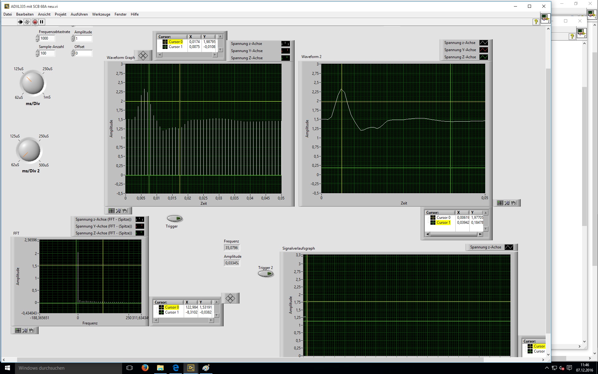 Es soll die Vibration einer Linearführung gemessen werden, diese 5-10 Sekunden idealerweise aufgezeichnet werden und je nach belieben Mittels Cursors einzelne Messpunkte in dem Graphen herausgegriffen werden um sie via FFT zu untersuchen.