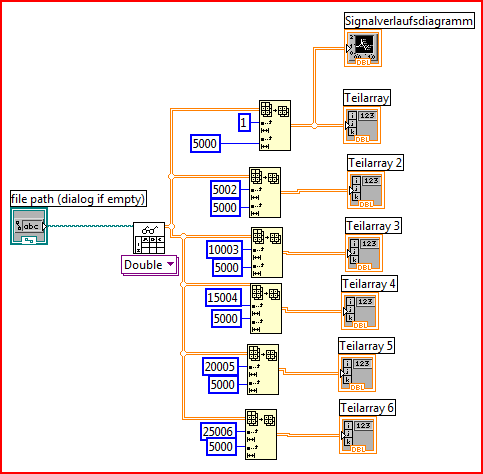 Hallo zusammen, ich bin ein LAbview Anfänger und möchte ein Programm schreiben was aus einer Tabelle (2 Spalten und 30 000 Zeilen) 6 Teilarrays bildet, zu je 5000 Zeilen der Ausgangstabelle(1. Array= Wert 1-5000 ; 2. Array= Wert 5000-10000 usw.). Diese Werte der Teilarrays möchte ich dann jeweils in einem Graph darstellen.