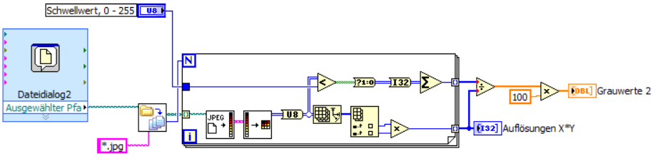 Zitat:Je nach Größe deiner Bilder kann dein VI übrigens fehlerhafte Grauwerte liefern, denn nach der Funktion "Boolean to (0,1)" hast du ein 2D-Array vom Datentyp I16 vorliegen. Sollten hier mehr als 32767 Einser enthalten sein, dann erzeugst du bei der darauf folgenden Summe einen Datenüberlauf...