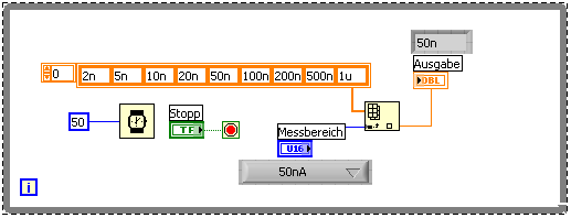 Deine Frage geht übrigens von völlig falschen Annahmen aus. Im Ring-Bedeinelement wählst Du einen Text aus, z.B den Text "50nA". Wenn Du das anwählt, übergibt der Ring z.B die Zahl 4. (Wenn "50nA" der 5.Text ist, vorher kommen die Texte 2nA (0), 5 nA (1), 10 nA (2) 20 nA (3) ). Deshalb glaube ich sagen zu dürfen, deine Bereichswahl geht niemals direkt über die ausgegebene Zahl des Ringes, sondern nur so wie im Beispiel unten.