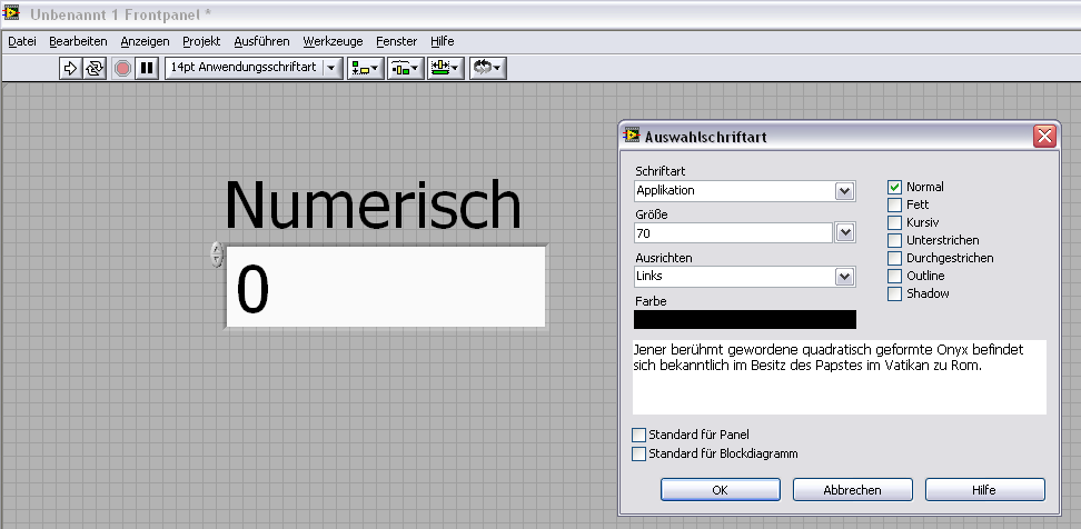 Falls du nur die numerische Anzeige ohne Überschrift/Titel vergrößern willst, dann nur die Zahl doppelklicken (also markieren), dann Strg+0 drücken, es öffnet sich der Schriftdialog. Geht übrigens mit allen Beschriftungen/Schriften/Zahlen... auf dem Frontpanel.