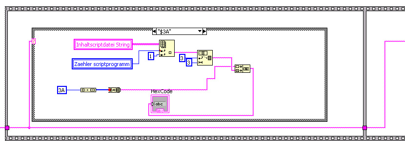 ich hatte leider erst jetzt wiedermal Gelegenheit weiter an meiner Problemstellung zu arbeiten, ich bin jetzt soweit das ich die Detektion auch das führende Dollarzeichen im Programm habe und dann die beiden folgenden Zeichen als HexCode in Ascii Darstellung interpretieren möchte, also ich gebe ein 53 oder 52 ein und möchte das diese Zahl so über die VISA-Schnittstelle weitergegeben wird, ich habe versucht das über die Schleife zu realisieren, aber er trennt mir die beiden Zeichen in zwei Einzelzeichen auf z.B. 35 33 oder 35 52, die restlichen Zeichen die den Wert enthalten werden korrekt übertragen.