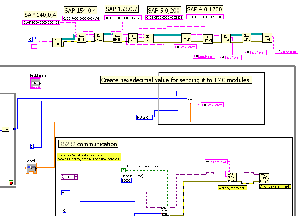 Hex-String 1( Microstep resolution) an Visa, dann Hex String 2( Maximum acceleration) an Visa usw. des Weiteren sollte der String vom SUB-VI TMCL auch noch direkt auf den Visa Port kommen.
