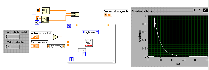 Ich hätte vielleicht noch hinzufügen sollen, daß es ein fortgeschrittener Benutzter eher nicht mit dem IIR-Filter machen wird, sondern natürlich direkt mit einem Hochpass-VI. Was man nimmt, ob Bessel oder Buttterworth, ist gleich, denn bei 1. Ordnung macht das keinen Unterschied: