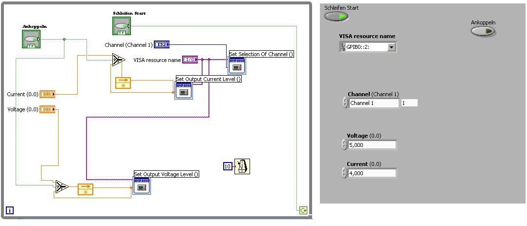 Pack deine Kommunikations-VIs in einen Case, der nur bei Ankoppeln=TRUE ausgeführt wird. So hast du genug Zeit zum Werte einstellen, bevor was zum Gerät geschickt wird.