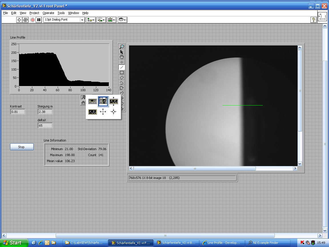 das Bild stellt eine aufgenommene schwarz/weiß Kante dar. Ich möchte von dieser Kante (ausgewählter Bereich, siehe 2.Attachment) DeltaX, die Steigung und den Kontrast bestimmen.