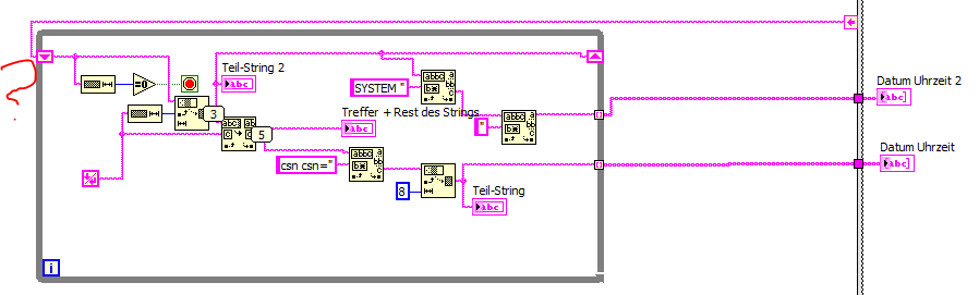 An deren Eingang Offset hast du das Ergebnis der Funktion Stringlänge angeschlossen, die wiederum die Textlänge der EOL-Konstanten bestimmen soll. Ergebnis dieser Operation: Du kürzt den String immer um die ersten 2 Zeichen/Byte (unter Windows) - und wunderst dich, warum du doppelte Suchergebnisse bekommst...