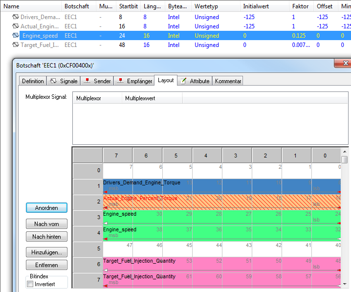 Startbit: 18, Länge: 14 INTEL durch den CANdb++ Editor angepasst ergibt es Startbit: 24, Länge: 14 MOTOROLA