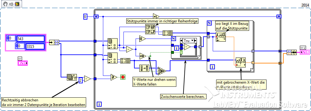 Dazu habe ich bisher mit dem VI interpolate 1D.vi aus der vi.lib rumprobiert. Da ergibt sich nur das Problem, dass entweder die X- oder die Y-Komponente monoton sein müssen. Das ist hier aber nicht der Fall - deshalb bin ich etwas ratlos.