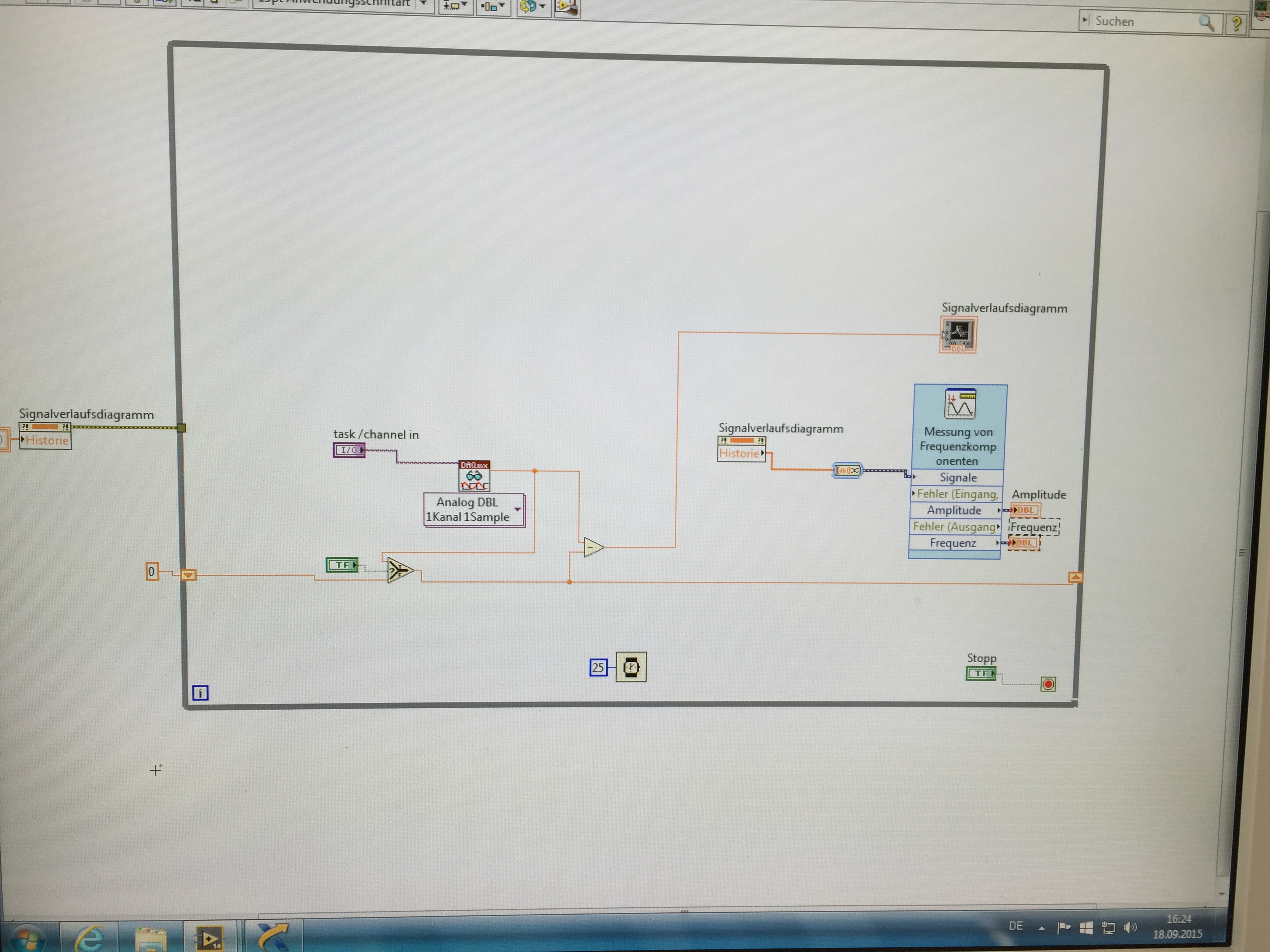 ich möchte das Signalverlaufsdiagramm gerne behalten und wie du mir empfohlen hast die Signalkomponenten wie Frequenz und Amplitude mittels zusätzlichem Graph bestimmen. Ich habe aber noch nicht ganz verstanden wie ich nun die Datenverbindung in den Graphen schaffe. Graphen akzeptieren keine Einzelwerte sondern nur die gesammelten Werte als Arrays - Ist dir aber klar als LabViewee. Nur bin ich da als Neuling mit meinem Wissen auf Grenzen gestoßen.