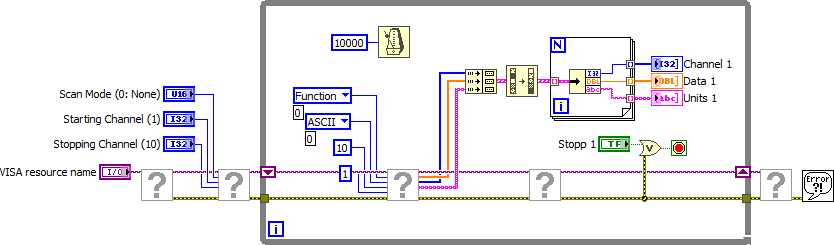 hier mal ein VI mit zwei separaten Schleifen. Du siehst( leider nur im Screenshot), dass der Array mit den Channels zwar geordnet ist aber nicht von 1 nach 10 geht. Die Reihenfolge ändert sich bei jedem Messwert. Ziel ist es den Array quasi zu fixieren und sicherzustellen das der erste Messwert im Array "Data" auch zum ersten Channel im Array "Channels" gehört.