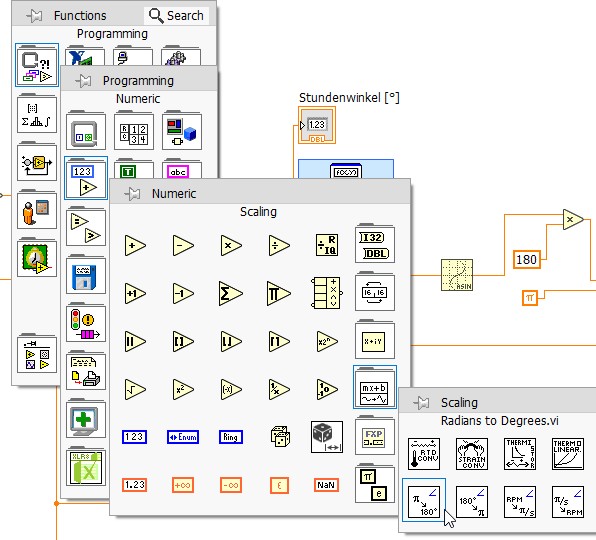 Übrigens, zur Umrechnung Radians<->Degree gibt es zwei fertige VIs in der Palette: