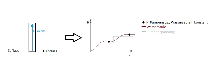 Die "Kennlinie" ist die Wasserhöhe als Funktion der Pumpenspannung. Die gilt es zu ermitteln.