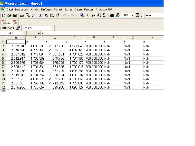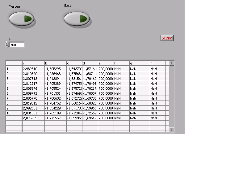 Ich häng mal zwei Tabellen an. Die eine aus LabVIEW, die andre aus Excel. Die Spalten mit NaN nicht beachten. Die Zahlen sind identisch, nur schreibt Excel an Stelle des Kommas einen Punkt, als 1000der Schritt, wodurch die Zahl riesig wird.